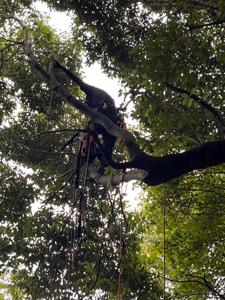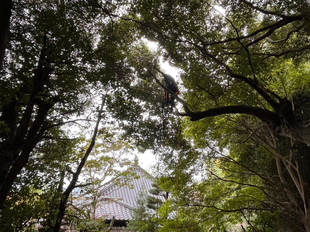 機械が入らない場所で、ロープを使って10mほど登って伐採してます。